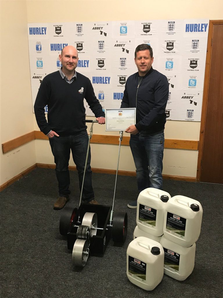 MH Goals Sales Director Matthew Harrod presented Matthews, who works as a director at Kempston Windows, with a PJM Linesman line marker machine along with 50L of ready-to-use paint.